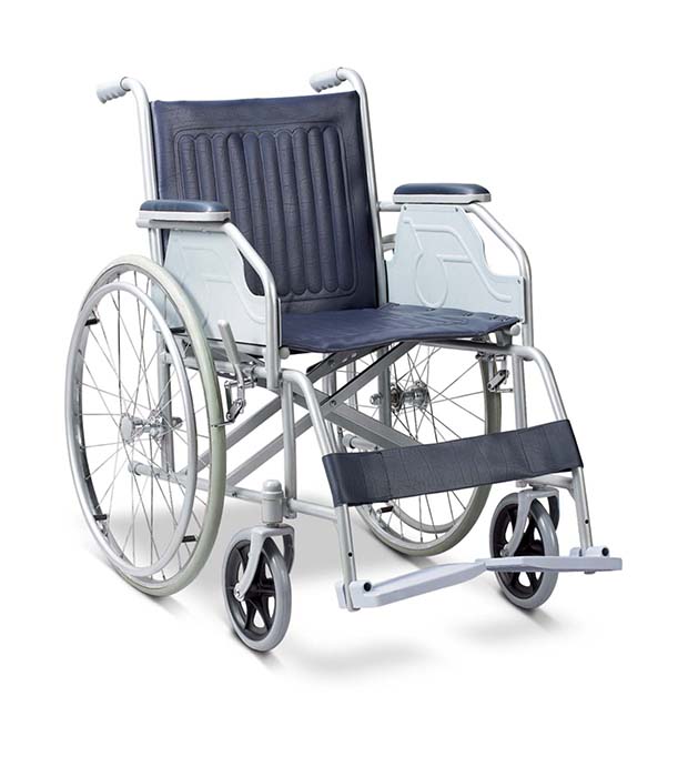 A self-propelled manual Wheel Chair incorporates a frame, seat, one or two footplates (footrests) and four wheels: usually two caster wheels at the front and two large wheels at the back. There will generally also be a separate seat cushion. The larger rear wheels usually have push-rims of slightly smaller diameter projecting just beyond the tyre; these allow the user to manouevre the chair by pushing on them without requiring them to grasp the tyres. Manual wheelchairs generally have brakes that bear on the tyres of the rear wheels, however these are solely a parking brake and in-motion braking is provided by the user’s palms bearing directly on the push-rims.