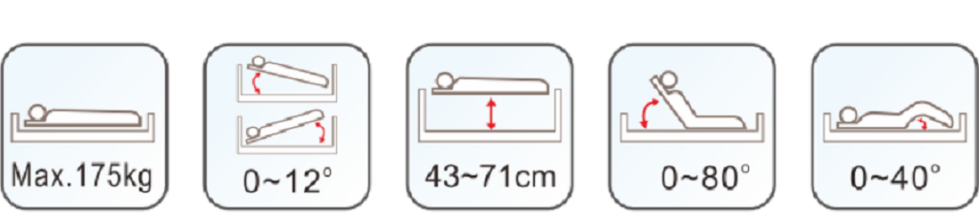 可锁定的轮子。为了安全起见,在将患者转移到床上或床下时,车轮可以锁定。